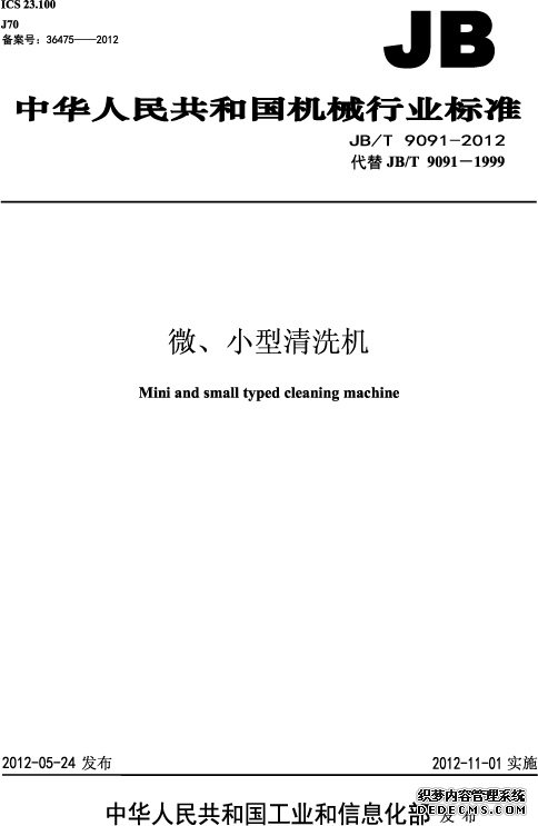 熊貓通用機(jī)械集團(tuán)有限公司和合肥通用機(jī)械研究所(即中國(guó)通用機(jī)械研究院)起草了《微、小型清洗機(jī)》的行業(yè)標(biāo)準(zhǔn),并在2012年11月1日正式開始實(shí)施。該 標(biāo)準(zhǔn)涉及了最大壓力40MPa,最大90L/min的大部分常見的高壓清洗機(jī),也可以說(shuō)就是高壓清洗機(jī)的行業(yè)標(biāo)準(zhǔn)。